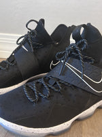 The Nike LeBron 14 Black Ice sneakers in size 15 are a stylish and high-quality athletic shoe designed for men. This model, part of the Nike LeBron product line, features a sleek black colorway with the iconic LeBron branding. With a focus on performance and comfort, these sneakers are perfect for basketball and other athletic activities, combining style and functionality for the modern man.